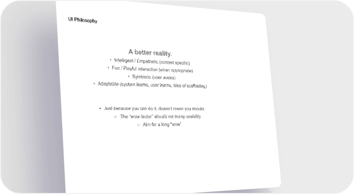 UI Philosophy n./Inr TrA ,T Intelligent / Empathetic (context specific) Fun / Playful interaction (when appropriate) Symbiotic (user aware) Adaptable (system learns, user learns, idea of scaffolding) just because you can do it, doesn't mean you should. o 'wow actor" should not trump usability Aim tor a long "wow"
