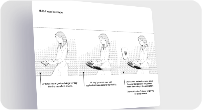 Hula-Hoop Interface ........ A 'swipe' hand gesture brings UI 'ring' UI 'ring' presents user with User selects application/menu object into the users field of view, application/menu options (scrollable) to expand experience (experience varies depending on the application) This could be the first step to opening up 'magic rooms'