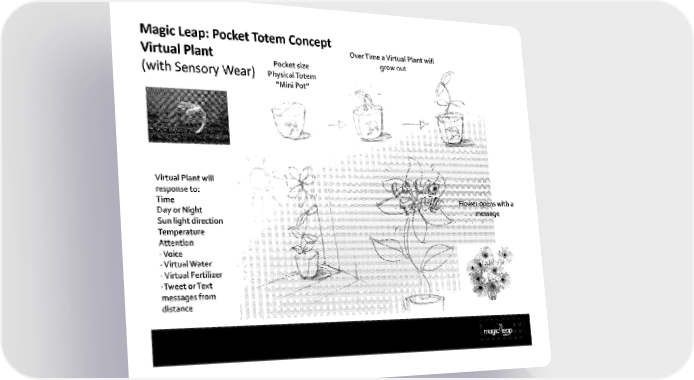 Magic Leap: Pocket Totem Concept Virtual Plant Over Time a Virtual Plant will Pocket size grow out (with Sensory Wear) Physical Totem "Mini Pot" "Fr Virtual Plant will response to: Time Day or Night Sun light direction Temperature Attention -Voice -Virtual Water Virtual Fertilizer - --Tweet or Text messages from distance