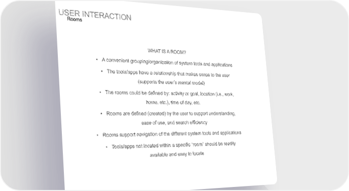 USER 1NTERA.CTON Rooms VVHA SAROOM? A convenient grouping/organization of system tools and applications Thetools/apps have a relationship that makes sense to the user (supports the user's m nta The rooms could be defined by: activity or goal, locationi.e,, work, home, e c. time of day, etc. Rooms are defined (created) by he user to support understandin ease of use, and search efficiency Rooms support navigation of the d iferent system tools and app !cations Tools/apps not located within a specific room" shou d be readily a ai rb e and easy to locate