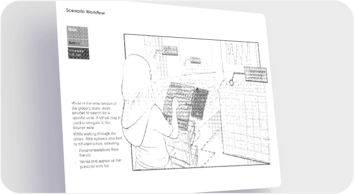 Scenario Workflow f f A f .. . • . •••••••••••••••:,:,:••x,x.x.x While in the we section of the grocery store, morn decides to search for a specific wine. A virtual map used to navigate to the desired wine.. While -walkng through the aisles, data appears attached to different wines, including Recommendations from friends Wines that appear on her personal wine list ,,,, .444444444444444444444444444444444444444444444444.144444,,,,,,,,,