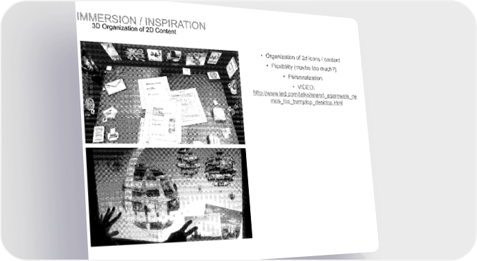 M ,E, ,S,ON f NSPI RATIO N 3D Organization of 2D Content Organization of 2d icons l content F exilD6 ty (maybe too much?) Personalization VIDEO: h tp://www,ted.comitalksianand_a.garawala de nos .464Y ,zzZ,