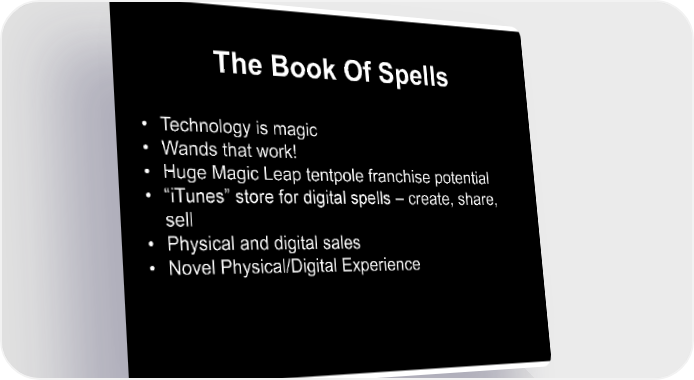 The Book Of Spells • Technology is magic • Wands that work! • Huge Magic Leap tentpole franchise potential • "iTunes" store for digital spells create, share, sell • Physical and digital sales • Novel Physical/Digital Experience