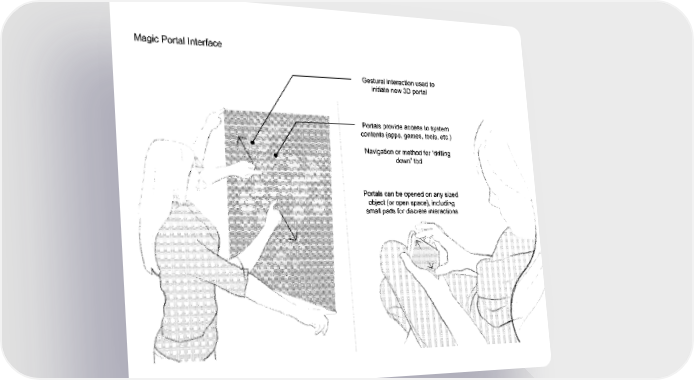 Magic Portal Interface Gestural interaction used to initiate new 3D portal Portals provide access to system contents (apps, games, tools. etc.) Navigation or method for "drilling down" tbd Portals can be opened on any sized object (or open space), including small pads for discrete interactions