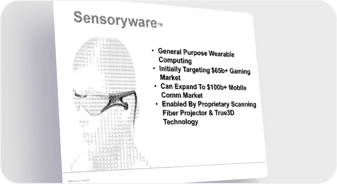 , v,7, /7/ r „as4 A % iii/. d A J • General Purpose Wearable Computing • Initially Targeting $65b+ Gaming Market • Can Expand To $100b+ Mobile Comm Market • Enabled By Proprietary Scanning Fiber Projector & True3D Technology
