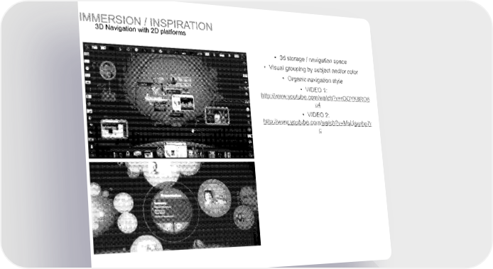 MNE, 3,0, / sPIRATION 3D Navigation with 2D platforms 3d storage navigation space Visual grouping by subject and/or color Organic navigation style VIDEO I: httg://www.you t be.comiwatch ,C4 9 = r 0 % 6 u4 VIDEO 2: h (,.;ortilwatc; ?v=!', , xn ip7r