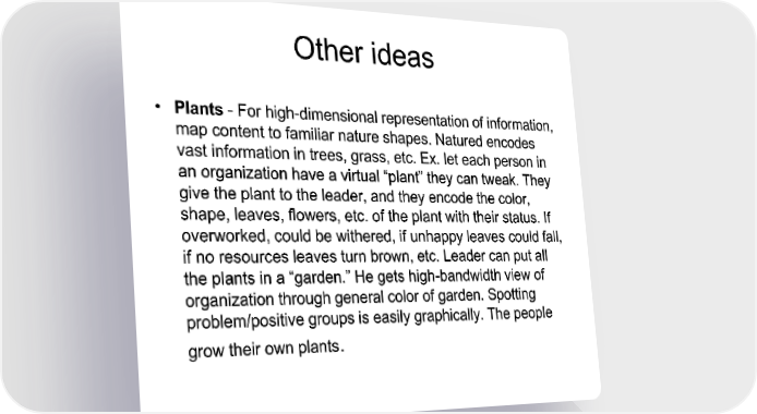 Other ideas • Plants - For high-dimensional representation of information, map content to familiar nature shapes. Natured encodes vast information in trees, grass, etc. Ex. let each person in an organization have a virtual "plant" they can tweak. They give the plant to the leader, and they encode the color, shape, leaves, flowers, etc. of the plant with their status. If overworked, could be withered, if unhappy leaves could fall, if no resources leaves turn brown, etc. Leader can put all the plants in a "garden." He gets high-bandwidth view of organization through general color of garden. Spotting problem/positive groups is easily graphically. The people grow their own plants.