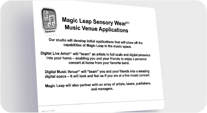 Magic Leap Sensory Weartm Music Venue Applications Our studio will develop initial applications that will show off the capabilities of Magic Leap in the music space. Digital Live Artisttm will "beam" an artists in full scale and digital presence into your home - enabling you and your friends to enjoy a personal concert at home from your favorite band. Digital Music Venuetm will "beam" you and your friends into a amazing digital space it will look and feel as if you are at a live music concert. Magic Leap will also partner with an array of artists, labels, publishers, and managers.
