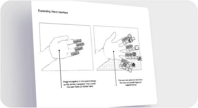 Magic Leap Page 76 Page 78Expanding Hand Interface Image recognition in the system brings The user can select an item from up the primary navigation menu when the menu or spread fingers to the user holds up his/her hand expand menus