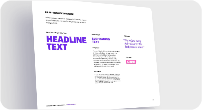 39 HEADLINE TEXT RULES + HIERARCHY: OVERVIEW Below is a basic example of typographic hierarchy. A wider range of examples and specific usage rules can be found on pages 41-46. Example: March of Dimes fights for the health of all moms and babies. We’re advocating for policies to protect them. We’re working to radically improve the health care they receive. We’re pioneering research to find solutions. We’re empowering families with the programs, knowledge and tools to have healthy pregnancies. By uniting communities, we’re building a brighter future for us all. Example: March of Dimes fights for the health of all moms and babies. We’re advocating for policies to protect them. We’re working to radically improve the health care they receive. We’re pioneering research to find solutions. We’re empowering families with the programs, knowledge and tools to have healthy pregnancies. By uniting communities, we’re building a brighter future for us all. SUBHEADING TEXT “We believe every baby deserves the best possible start.” Headlines 1: Single Color Text Subheading 1 Body Copy CTA: Print Pull Quote Small Text MARCH OF DIMES • BRAND BOOK • VISUAL IDENTITY