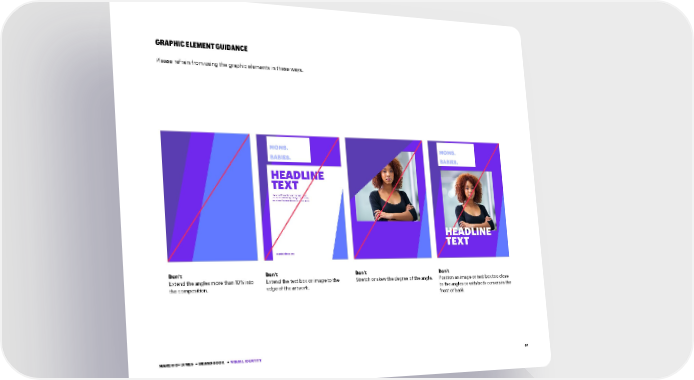 57 GRAPHIC ELEMENT GUIDANCE Please refrain from using the graphic elements in these ways. MARCH OF DIMES • BRAND BOOK • VISUAL IDENTITY March of Dimes fights for the health of all moms and babies. By uniting communities, we’re working towards a better future for all. HEADLINE TEXT marchofdimes.org Don’t Extend the angles more than 10% into the composition. Don’t Extend the text box or image to the edge of the artwork. Don’t Stretch or skew the degree of the angle. Don’t Position an image or text box too close to the angles or with both corners in the front or back. HEADLINE TEXT
