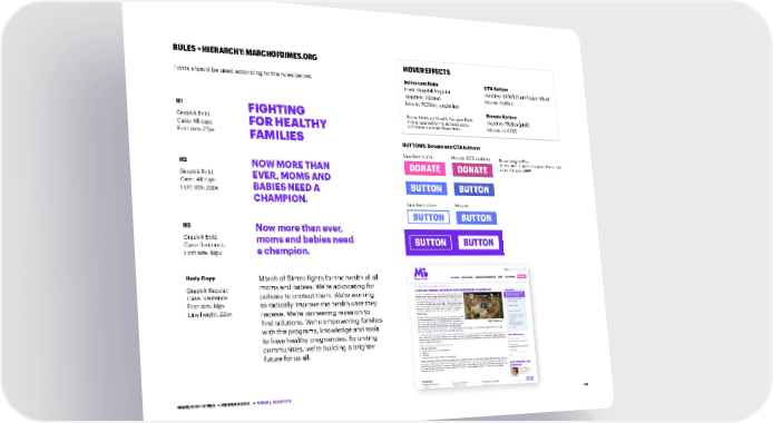 46 Button labels are Graphik Compact Black. Pink is reserved for the donate button. CTA buttons are cornflower blue. RULES + HIERARCHY: MARCHOFDIMES.ORG Fonts should be used according to the rules below. H1 Graphik Bold, Case: All caps Font size: 27px FIGHTING F O R H E A LT H Y FAMILIES Body Copy March of Dimes fights for the health of all moms and babies. We’re advocating for policies to protect them. We’re working to radically improve the health care they receive. We’re pioneering research to find solutions. We’re empowering families with the programs, knowledge and tools to have healthy pregnancies. By uniting communities, we’re building a brighter future for us all. Graphik Regular, Case: Sentence Font size: 14px Line height: 22px H2 H3 Graphik Bold, Case: All caps Font size: 22px Graphik Bold, Case: Sentence, Font size: 18px NOW MORE THAN EVER, MOMS AND BABIES NEED A CHAMPION. Now more than ever, moms and babies need a champion. Inline text links Font: Graphik Regular Inactive: 7029ec Hover: 7029ec, underline CTA Button Inactive: 6179ff (Cornflower Blue) Hover: 4 e 61cc Donate Button Inactive: ff52ba (pink) Hover: cc4295 HOVER EFFECTS BUTTONS: Donate and CTA buttons Inactive state Inactive state Hover: 20% darken Hover: D O N ATE D O N ATE BUTTON BUTTON BUTTON BUTTON BUTTON BUTTON Button height: 37px Button text: Graphic Compact Black, 18px Case: All caps, #ffffff MARCH OF DIMES • BRAND BOOK • VISUAL IDENTITY