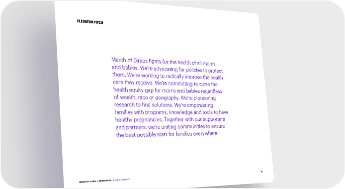 12 ELEVATOR PITCH March of Dimes fights for the health of all moms and babies. We’re advocating for policies to protect them. We’re working to radically improve the health care they receive. We’re committing to close the health equity gap for moms and babies regardless of wealth, race or geography. We’re pioneering research to find solutions. We’re empowering families with programs, knowledge and tools to have healthy pregnancies. Together with our supporters and partners, we’re uniting communities to ensure the best possible start for families everywhere. MARCH OF DIMES • BRAND BOOK • VERBAL IDENTITY