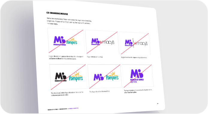 30 Logos should not appear closer than the clearspace guidance outlined on the previous page. Logos should not overlap. Logos should not be separated by divider lines. The black and white logo should not be used for collateral pieces in color. The logo should not be modified. The logo should not be paired with chapters or text other than the tagline. Below are examples of how not to use the logo in co-branding situations. Please refrain from pairing the logo with partners in these ways. CO-BRANDING MISUSE MARCH OF DIMES • BRAND BOOK • VISUAL IDENTITY