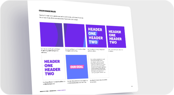 35 COLOR USAGE/RULES March of Dimes’ color palette was built to be flexible, with Brand Purple as the primary focus. Below are examples of approved color usage. Use the Accent Purple with Brand Purple for graphic background elements. Use Brand Purple for main headlines on a white background. Use Accent Purple and Cornflower Blue for angles and layering. Use Hot Pink with white text on primary or white background color for CTAs. Use Cornflower for angle highlights within headlines. Use Black for body copy on a white background. Use colors with high contrast for headlines. March of Dimes fights for the health of all moms and babies. We’re advocating for policies to protect them. We’re working to radically improve the healthcare they receive. We’re pioneering research to find solutions. We’re empowering families with the programs, knowledge and tools to have healthier pregnancies. By uniting communities, we’re building a brighter future for us all. HEADER ONE HEADER TWO HEADER ONE HEADER TWO HEADER ONE HEADER TWO MARCH OF DIMES • BRAND BOOK • VISUAL IDENTITY