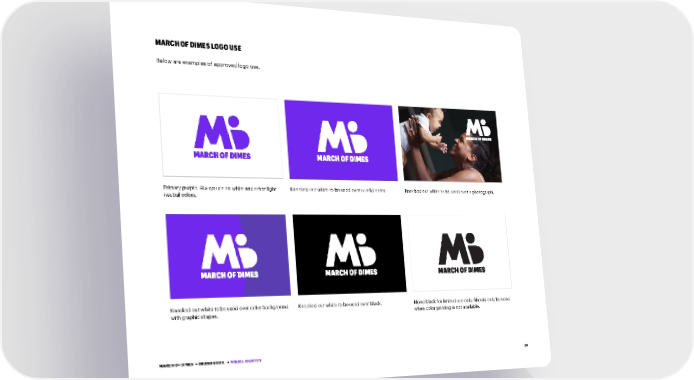 26 MARCH OF DIMES LOGO USE Below are examples of approved logo use. Primary purple. Always use on white and other light neutral colors. Knocked out white to be used over color background with graphic shapes. Knocked out white to be used over a solid color. Knocked out white to be used over black. Knocked out white to be used over a photograph. Mono black for limited use only. Should only be used when color printing is not available. MARCH OF DIMES • BRAND BOOK • VISUAL IDENTITY