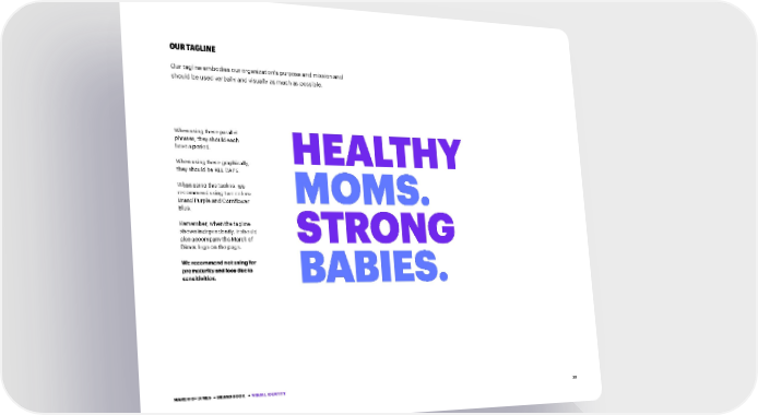 22 OUR TAGLINE Our tagline embodies our organization’s purpose and mission and should be used verbally and visually as much as possible. When using these parallel phrases, they should each have a period. When using these graphically, they should be ALL CAPS. When using this tagline, we recommend using two colors: Brand Purple and Cornflower Blue. Remember, when the tagline shown independently, it should also accompany the March of Dimes logo on the page. We recommend not using for prematurity and loss due to sensitivities. MARCH OF DIMES • BRAND BOOK • VISUAL IDENTITY