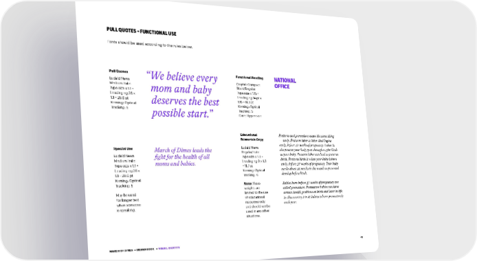 42 PULL QUOTES + FUNCTIONAL USE Fonts should be used according to the rules below. Pull Quotes Eudald News Medium Italic Type size x 1.1 = Leading eg 26 x 1.1 = 28.6 pt Kerning: Optical Tracking: 5 Special Use Eudald News Medium Italic Type size x 1.1 = Leading eg 26 x 1.1 = 28.6 pt Kerning: Optical Tracking: 5 May be used for longer text when someone is speaking. Educational Resources Copy Eudald News Regular/Italic Type size x 1.3 = Leading eg 9 x 1.3 = 11.7 pt Kerning: Optical Tracking: 0 Functional Heading Graphik Compact Black/Regular Type size x 1.15 = Leading eg 14 pt x 1.15 = 16.1 pt Kerning: Optical Tracking: 5 Case: Uppercase Note: These weights are limited to the use of educational resources only and should not be used in any other situations. MARCH OF DIMES • BRAND BOOK • VISUAL IDENTITY March of Dimes leads the fight for the health of all moms and babies. “We believe every mom and baby deserves the best possible start.” Preterm and premature mean the same thing — early. Preterm labor is labor that begins early, before 37 weeks of pregnancy. Labor is the process your body goes through to give birth to your baby. Preterm labor can lead to preterm birth. Preterm birth is when your baby is born early, before 37 weeks of pregnancy. Your baby needs about 40 weeks in the womb to grow and develop before birth. Babies born before 37 weeks of pregnancy are called premature. Premature babies can have serious health problems at birth and later in life. In this country 1 in 10 babies is born prematurely each year. NATIONAL OFFICE