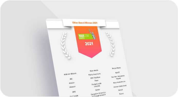Other Award Winners 2021 2021 3MNew york - Presbyterian Hospital Activision BlizzardFiservNissan North America Morgan Stanley Exxon Mobile Activision Blizzard AIGFlorida A and MOmnicom Media Group University Fidelity Investments NAACP AIG Fifth Third Bank AmazonGensler Parsons New York - Presbyterian Amazon Fiserv Hospital Atlassain Florida A and M Nissan North America University AtlassainGeorgetown University’s Pepsico McDonough School of AWS Business Omnicom Media Group Gensler Bell Canada AWSHCL Technologies Pure Storage Parsons Georgetown University’s McDonough School of Blackrock Pepsico Bell Canada Hewlett Packard PwC strategy+Business Business Enterprise HCL Technologies Pure Storage Blackrock Hitachi Roche Blue Cross Blue Shield TN Hewlett Packard PwC Strategy+Business Enterprise Blue Cross Blue IBM Watson Sage Shield TN BMO Roche Hitachi BMOICF Schnieder Electric IBM Watson Sage Booz Allen Hamilton ICF Schnieder Electric Booz Allen HamiltonICON Sheppard PrattCisco ICON Sheppard Pratt Coldwell Banker CiscoJConnelly Thomson Reuters JConnelly Thomson Reuters Real Estate JLL UN Comcast NBC Coldwell BankerJLL cJohns Hopkins Vangaurd Real Estate Universal Health Care Viacom CBS Comcast NBCJohns Hopkins United Healthcare Constellation Energy Korn Ferry UniversalHealth Care Villanova Dell Lockheed Martin Constellation EnergyKorn Ferry Vangaurd Direct Energy Volkswagen Mastercard Edelman McKinsey Publishing Washington University DellLockheed Martin Viacom CBS Direct Energy Mastercard Villanova EdelmanMcKinsey Publishing Volkswagen Exxon Mobile Morgan Stanley Washington University Fidelity InvestmentsNAACP Fifth Third Bank