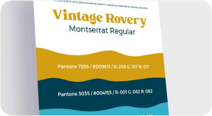 The following fonts and colors should be used in marketing materials for Marine Life 2030: Vintage Rovery Montserrat Regular Pantone 7555 / #D09E11 / R: 208 G: 157 B: 017 Pantone 3035 / #004153 / R: 001 G: 062 B: 082 Pantone 631 / #3CB6CE / R: 006 G: 175 B: 196