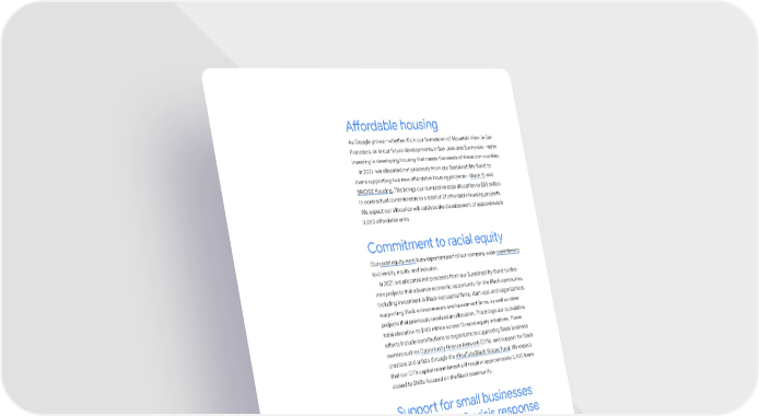 Affordable housing As Google grows—whether it’s in our hometown of Mountain View, in San Francisco, or in our future developments in San José and Sunnyvale—we’re investing in developing housing that meets the needs of these communities. In 2021, we allocated net proceeds from our Sustainability Bond to loans supporting two new affordable housing projects—Block 15 and BRIDGE Housing. This brings our cumulative total allocation to $83 million in contractual commitments to a total of 21 affordable housing projects. We expect our allocation will catalyze the development of approximately 3,050 affordable units. Commitment to racial equity Our racial equity work is an important part of our company-wide commitment to diversity, equity, and inclusion. In 2021, we allocated net proceeds from our Sustainability Bond to nine new projects that advance economic opportunity for the Black community, including investment in Black-led capital firms, start-ups, and organizations supporting Black entrepreneurs and investment firms, as well as other projects that previously received an allocation. This brings our cumulative total allocation to $148 million across 15 racial equity initiatives. These efforts include contributions to organizations supporting Black business owners such as Opportunity Finance Network (OFN), and support for Black creators and artists through the #YouTubeBlack Voices Fund. We expect that our OFN capital commitment will result in approximately 3,700 loans closed to SMBs focused on the Black community. Support for small businesses and COVID-19 crisis response Small businesses are the backbone of the global economy and at the core of many of Google’s tools, services, and products. So when the COVID-19 pandemic hit in 2020, we announced a $200 million investment fund as part of our $800+ million commitment to support SMBs, health organizations, governments, and health workers on the frontlines. In 2021, we allocated net proceeds from our Sustainability Bond to four new projects that finance loans to small businesses, including long-term partnerships with lending institutions such as Kiva, the European Investment Fund, the Small Industries Development Bank of India, and the Ogen Group. This brings our cumulative total allocation to $185 million in contractual commitments that finance loans to small businesses. We expect our capital commitment will result in approximately 46,950 loans closed to SMBs. Alphabet Sustainability Bond Impact Report 2022 Featured projects and impact 14