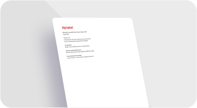 Alphabet Sustainability Bond Impact Report 2022 August 2022 On the cover: A dragonscale solar panel rooftop emerges amidst trees at our Charleston East campus (Photo: Iwan Baan) Introduction: Bright, colorful Gbikes parked on a Google campus About our Sustainability Bond: Norther Offshore wind farm in Belgium (92 MW for Google) Featured projects and impact: A row of servers in our St. Ghislain, Belgium, data center