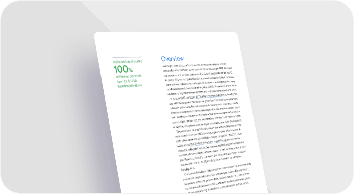 Alphabet has allocated Overview 100% At Google, operating our business in an environmentally and socially responsible way has been a core value since our founding in 1998. We build of the net proceeds our products and services to improve the lives of people all over the world. from its $5.75B As pa爀琀 of this, we recognize Google’s tremendous responsibility to address Sustainability Bond. some of the most pressing challenges of our time—climate change, housing, racial and economic inequity, and the global COVID-19 pandemic. We’ve made a number of signi昀椀cant commitments and major investments in these areas. In August 2020, we issued $5.75 billion in sustainability bonds, leading the way with the largest sustainability or green bond issuance by any company in history at the time. The net proceeds funded new and ongoing projects that are environmentally or socially responsible and enable investors to join us in tackling critical issues. We believe that these investments bene昀椀t our communities, employees, and stakeholders, and they’re an impo爀琀ant pa爀琀 of ful昀椀lling Google’s mission and goal of creating value over the long term. Two years later, we are pleased to repo爀琀 that we have fully allocated the net proceeds from our 2020 issuance, suppo爀琀ing our e昀昀o爀琀s across all eight of our green and social Eligible Project categories. This 2022 repo爀琀 builds on our 2021 Sustainability Bond Impact Repo爀琀 and covers the allocation to Eligible Projects that incurred expenditures or had capital or contractual commitments between January 1, 2019, and December 31, 2021 (the “Repo爀琀ing Period”). Our repo爀琀 also covers the associated expected sustainability impact of Eligible Projects included in our allocation (see Figure 1). Our Sustainability Bond helps us operate our business in an environmentally and socially responsible way. Our ultimate goal is to enable everyone— businesses, investors, policymakers, and individuals—to create and live in a more sustainable world. We continue to lead and encourage others to join us in improving the health of our communities and our planet. Alphabet Sustainability Bond Impact Report 2022 Introduction 33