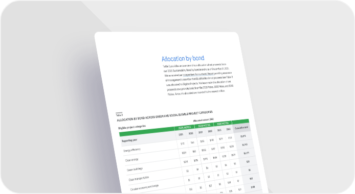 Allocation by bond Table 3 provides an overview of our allocation of net proceeds from our 2020 Sustainability Bond by bond tranche as of December 31, 2021. We’ve received an Independent Accountants’ Report providing assurance of management’s assertion that $5.688 billion in net proceeds (see Table 1) was allocated to Eligible Projects. We have made this allocation of net proceeds on a pro rata basis from the 2025 Notes, 2030 Notes, and 2050 Notes. Amounts allocated are rounded to the nearest million. Table 3 ALLOCATION BY BOND ACROSS GREEN AND SOCIAL ELIGIBLE PROJECT CATEGORIES Eligible project categories Allocated amount ($M) 2025 NOTES 2030 NOTES 2050 NOTES Reporting year 2021 2022 2021 2022 2021 2022 Cumulative total Energy efficiency $112 $66 $252 $148 $277 $163 $1,018 Clean energy $224 $83 $502 $187 $552 $205 $1,753 Green buildings $218 $215 $490 $481 $538 $529 $2,471 Clean transportation $3 $1 $6 $3 $6 $3 $22 Circular economy and design $1 $1 $2 $1 $2 $1 $8 Affordable housing $12 $2 $27 $5 $30 $7 $83 Commitment to racial equity $14 $12 $32 $26 $35 $29 $148 Support for small businesses and 4 COVID-19 crisis response $23 $9 $52 $21 $58 $22 $185 TOTAL ALLOCATION OF NET PROCEEDS $607 $389 $1,363 $872 $1,498 $959 $5,688 Net proceeds allocated by tranche (%) 61% 39% 61% 39% 61% 39% 100% Alphabet Sustainability Bond Impact Report 2022 Appendix 16