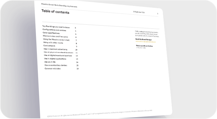 Table of contents Top five things you need to know 3 Configurations and versions 4 Color specifications 5 Minimum sizes and free space 6 Using the Maestro name in text 7 Using with other marks 8 Card artwork 9 Use in merchant advertising 10 Use at physical merchant locations 11 Use at digital merchant locations 12 Use in digital applications 13 Use on ATMs 14 Use on contactless devices 15 Common mistakes 16 2 30 September 2016 Maestro Brand Mark: Branding requirements If after reading the branding requirements you still haven’t found the answer to your query, please contact us in one of two ways. Email the Brand Manager ask.brand.manager@mastercard.com Mastercard Brand Hotline 1-914-249-1326 ©2016 Mastercard. All rights reserved. Mastercard®, Maestro®, and Cirrus® are registered trademarks, and the circles design is a trademark of Mastercard International Incorporated.