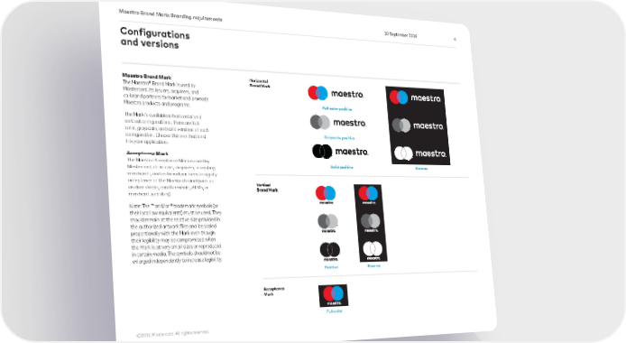 Vertical Brand Mark Acceptance Mark Horizontal Brand Mark Solid positive Full-color positive Grayscale positive Reverse Positive Reverse Full-color 4 30 September 2016 Maestro Brand Mark: Branding requirements ©2016 Mastercard. All rights reserved. Maestro Brand Mark The Maestro® Brand Mark is used by Mastercard, its issuers, acquirers, and co-brand partners to market and promote Maestro products and programs. The Mark is available in horizontal and vertical configurations. There are full- color, grayscale, and solid versions of each configuration. Choose the one that best fits your application. Acceptance Mark The Maestro Acceptance Mark is used by Mastercard, its issuers, acquirers, accepting merchants, and co-brand partners to signify acceptance of the Maestro brand (such as on door decals, card terminals, ATMs, or merchant websites). Note: The ™ and / or ® trademark symbols (or their local law equivalents) must be used. They should remain at the relative size provided in the authorized artwork files and be scaled proportionally with the Mark even though their legibility may be compromised when the Mark is at very small sizes or reproduced in certain media. The symbols should not be enlarged independently to increase legibility. Configurations and versions