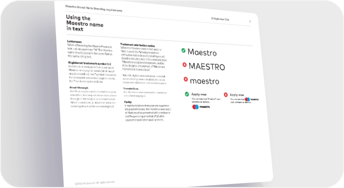 Maestro MAESTRO maestro Apply now You can use your card at home or abroad. Apply now You can use your Maestro ® card at home or abroad. 7 30 September 2016 Maestro Brand Mark: Branding requirements ©2016 Mastercard. All rights reserved. Lettercase When referencing the Maestro® name in text, use an uppercase “M.” The Maestro name should appear in the same font as the surrounding text. Registered trademark symbol ( ® ) In the first or most prominent text use of Maestro on a page or screen (after use, if any, in a headline), the ® symbol is required. In subsequent use on that page or screen, the ® symbol may be omitted. Read-through The Mark may be used as a read-through in a headline, but may not be used as a read- through in the body of a communication. When used in text, it should be set in the same typeface as the surrounding text. Trademark attribution notice When the Maestro name in text and / or Mark is used, the following trademark attribution notice (in a very small type size) should be included once in the communication: “Maestro is a registered trademark, and the circles design is a trademark of Mastercard International Incorporated.” Note: On digital communications and small- size marketing communications, the above trademark attribution notice is not required. Translations The Maestro name must not be translated into other languages. Parity In communications that promote more than one payment brand, the Maestro name and / or Mark must be presented with prominence and frequency equal to that of all other payment brand names and / or marks. Using the Maestro name in text
