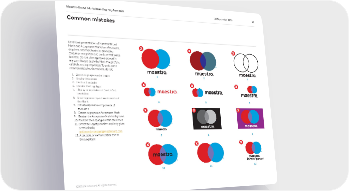 lorem ipsum 1 2 3 4 5 6 7 8 9 10 11 12 16 30 September 2016 Maestro Brand Mark: Branding requirements ©2016 Mastercard. All rights reserved. Consistent presentation of Maestro® Brand Marks and Acceptance Marks benefits issuers, acquirers, and merchants, by promoting consumer recognition and card use that builds business. Do not alter approved artwork in any way. Always apply the Mark thoughtfully, carefully, and appropriately. To avoid some common mistakes shown here, do not: 1. Omit the purple center shape 2. Recolor the circles 3. Outline the circles 4. Recolor the Logotype 5. Display or reproduce at insufficient resolution 6. Reconfigure or reposition elements of the Mark 7. Individually resize components of the Mark 8. Create a grayscale Acceptance Mark 9. Recolor the Acceptance Mark background 10. Position the Logotype within the circles 11. Omit the Logotype unless explicitly given permission by [email protected] 12. Alter, add, or combine other text to the Logotype Common mistakes