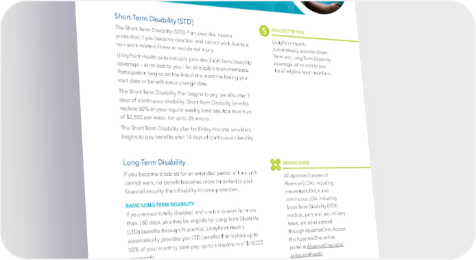 Short-Term Disability & Long-Term Disability Short-Term Disability (STD) NO COST TO YOU The Short-Term Disability (STD) Plan provides income UnityPoint Health protection if you become disabled and cannot work due to a automatically provides Short- non-work-related illness or accidental injury. Term and Long-Term Disability UnityPoint Health automatically provides Short-Term Disability coverage- at no cost to you- coverage – at no cost to you – for all eligible team members. for all eligible team members. Participation begins on the 昀椀rst of the month following your start date or bene昀椀t status change date. The Short-Term Disability Plan begins to pay bene昀椀ts after 7 days of continuous disability. Short-Term Disability bene昀椀ts replace 60% of your regular weekly base pay, to a maximum of $2,500 per week, for up to 26 weeks. The Short-Term Disability plan for Finley Hospital providers begins to pay bene昀椀ts after 14 days of continuous disability. Long-Term Disability ABSENCEONE If you become disabled for an extended period of time and All approved Leaves of cannot work, no bene昀椀t becomes more important to your Absence (LOA), including 昀椀nancial security than disability income protection. intermittent FMLA and BASIC LONG-TERM DISABILITY continuous LOA, including If you remain totally disabled and unable to work for more Short-Term Disability (STD), than 180 days, you may be eligible for Long-Term Disability medical, personal, and military (LTD) bene昀椀ts through Prudential. UnityPoint Health leave, are administered automatically provides you LTD bene昀椀ts that replace up to through AbsenceOne. Access 50% of your monthly base pay, up to a maximum of $10,000 the AbsenceOne online per month. portal at AbsenceOne.com/ Monthly LTD bene昀椀ts will be reduced by Social Security and unitypointhealth. any other disability income you are eligible to receive, such as Workers’ Compensation. BUY-UP LONG-TERM DISABILITY You can purchase additional LTD coverage through Prudential that will increase your monthly bene昀椀t to 60% of your monthly pay. The cost of this additional coverage is available in Lawson during your enrollment. | 31 |