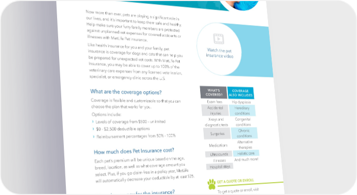 Pet Insurance Now more than ever, pets are playing a signi昀椀cant role in our lives, and it’s important to keep them safe and healthy. Help make sure your furry family members are protected against unplanned vet expenses for covered accidents or illnesses with MetLife Pet Insurance. Like health insurance for you and your family, pet Watch the pet insurance is coverage for dogs and cats that can help you insurance video be prepared for unexpected vet costs. With MetLife Pet Insurance, you may be able to cover up to 100% of the veterinary care expenses from any licensed veterinarian, specialist, or emergency clinic across the U.S. What are the coverage options? WHAT’S COVERAGE COVERED? ALSO INCLUDES Coverage is 昀氀exible and customizable so that you can Exam fees Hip dysplasia choose the plan that works for you. Accidental Hereditary Options include: injuries conditions › X-rays and Congenital L evels of coverage from $500 – unlimited › diagnostic tests conditions $0 - $2,500 deductible options Chronic › Surgeries Reimbursement percentages from 50% - 100% conditions Medications Alternative How much does Pet Insurance cost? therapies Each pet’s premium will be unique based on the age, Ultrasounds Holistic care breed, location, as well as what coverage amount you Illnesses And much more! select. Plus, if you go claim-free in a policy year, MetLife Hospital stays will automatically decrease your deductible by at least $25. GET A QUOTE OR ENROLL How do you pay for the insurance? To get a quote or enroll, visit You can set up an automatic payment from your bank or metlife.com/getpetquote or credit card with MetLife. call (800) GET-MET8. | 33 |