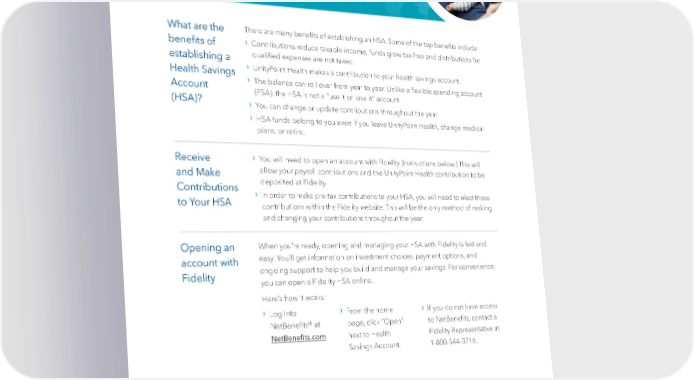 Health Savings Account (HSA) What are the There are many bene昀椀ts of establishing an HSA. Some of the top bene昀椀ts include: bene昀椀ts of › C ontributions reduce taxable income, funds grow tax-free and distributions for establishing a quali昀椀ed expenses are not taxed. Health Savings › UnityP oint Health makes a contribution to your health savings account. Account › T he balance can roll over from year to year. Unlike a 昀氀exible spending account (FSA), the HSA is not a “use it or lose it” account. (HSA)? › Y ou can change or update contributions throughout the year. › HSA funds belong to you even if you leave UnityPoint Health, change medical plans, or retire. Receive › Y ou will need to open an account with Fidelity (instructions below.) This will and Make allow your payroll contributions and the UnityPoint Health contribution to be Contributions deposited at Fidelity. to Your HSA › I n order to make pre-tax contributions to your HSA, you will need to elect those contributions within the Fidelity website. This will be the only method of making and changing your contributions throughout the year. Opening an When you’re ready, opening and managing your HSA with Fidelity is fast and account with easy. You’ll get information on investment choices, payment options, and Fidelity ongoing support to help you build and manage your savings. For convenience, you can open a Fidelity HSA online. Here’s how it works: › › › Log into F rom the home If you do not have access NetBene昀椀ts® at page, click “Open” to NetBene昀椀ts, contact a NetBene昀椀ts.com next to Health Fidelity Representative at Savings Account. 1-800-544-3716. | 13 |