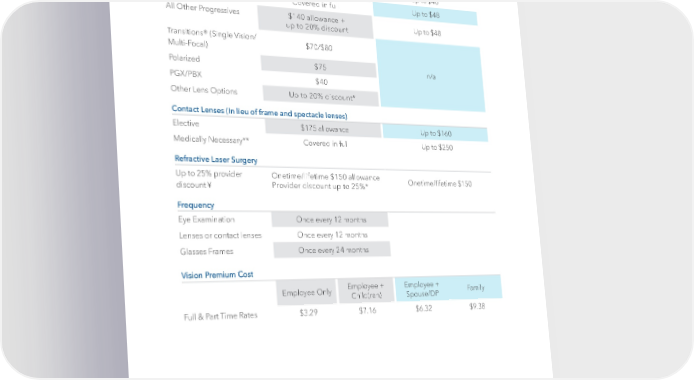 Vision Insurance, continued Preferred Pricing Options, continued Level 1 Progressives Covered in full Up to $40 Level 2 Progressives Covered in full Up to $48 All Other Progressives $140 allowance + Up to $48 up to 20% discount TransitionsĀ® (Single Vision/ $70/$80 Multi-Focal) Polarized $75 n/a PGX/PBX $40 Other Lens Options Up to 20% discount* Contact Lenses (In lieu of frame and spectacle lenses) Elective $175 allowance Up to $160 Medically Necessary** Covered in full Up to $250 Refractive Laser Surgery Up to 25% provider Onetime/lifetime $150 allowance Onetime/lifetime $150 discount Ā„ Provider discount up to 25%* Frequency Eye Examination Once every 12 months Lenses or contact lenses Once every 12 months Glasses Frames Once every 24 months Vision Premium Cost Employee Only Employee + Employee + Family Child(ren) Spouse/DP Full & Part Time Rates $3.29 $7.16 $6.32 $9.38 | 18 |