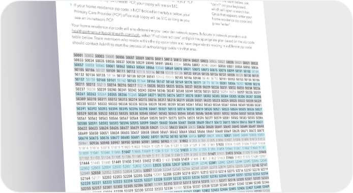 Health Insurance, continued Zip Code Table for PCP Of昀椀ce Visit Copay and QUICK SEARCH Provider Network If you enroll in the Network Plan and your home residence zip code is bolded in For a quick way to see if your home residence zip code is the table below, your Primary Care Provider (PCP) of昀椀ce visit copay will increase to listed in the table below, use $50 if you choose to see an in-network, non-UnityPoint Health PCP. If your PCP “ctrl+F” on your keyboard, Of昀椀ce Visit is to a UnityPoint Health PCP, your copay will remain $10. which will open a search bar. › Once that appears, enter your If your home residence zip code is NOT bolded in the table below, your home residence zip code and Primary Care Provider (PCP) of昀椀ce visit copay will be $10 as long as you press “enter”. see an in-network PCP. Your home residence zip code will also determine your provider network access. To locate in network providers visit healthpartnersunitypointhealth.com/uph, select “Find covered care” and pick the appropriate plan based on the zip code table below. Team members who reside within the zip code table and have dependents residing in a different zip code should contact AskHR to start the process of authorizing providers in that area. 50001 50002 50003 50005 50006 50007 50009 50010 50011 50012 50013 50014 50021 50023 50026 50027 50028 50029 50031 50032 50033 50034 50035 50036 50037 50038 50039 50040 50041 50043 50044 50046 50047 50048 50049 50050 50051 50054 50055 50056 50057 50058 50060 50061 50062 50063 50064 50066 50068 50069 50070 50071 50072 50073 50075 50078 50099 50101 50102 50104 50105 50106 50107 50109 50111 50112 50115 50116 50118 50119 50120 50122 50124 50125 50126 50127 50128 50129 50130 50131 50132 50134 50135 50136 50137 50138 50139 50141 50142 50143 50145 50146 50148 50149 50150 50151 50152 50153 50154 50156 50157 50158 50160 50161 50162 50163 50164 50166 50167 50168 50169 50170 50171 50173 50174 50201 50206 50207 50208 50210 50211 50212 50213 50214 50216 50217 50219 50220 50223 50225 50226 50227 50228 50229 50230 50231 50232 50233 50234 50236 50237 50238 50239 50240 50241 50242 50243 50244 50246 50247 50248 50249 50250 50251 50252 50254 50256 50257 50258 50259 50261 50263 50264 50265 50266 50268 50269 50271 50275 50276 50277 50278 50301 50302 50303 50304 50305 50306 50307 50308 50309 50310 50311 50312 50313 50314 50315 50316 50317 50318 50319 50320 50321 50322 50323 50324 50325 50327 50328 50329 50330 50331 50332 50333 50334 50335 50336 50339 50340 50359 50360 50361 50362 50363 50364 50367 50368 50369 50380 50381 50391 50392 50393 50394 50395 50396 50398 50441 50501 50510 50516 50518 50519 50520 50521 50523 50524 50525 50526 50527 50529 50530 50532 50533 50535 50538 50540 50541 50542 50543 50544 50545 50546 50548 50551 50552 50554 50557 50558 50560 50561 50562 50563 50566 50567 50568 50569 50570 50571 50573 50574 50575 50576 50577 50579 50581 50582 50583 50585 50586 50588 50591 50592 50593 50594 50595 50599 50601 50602 50604 50607 50608 50609 50611 50612 50613 50614 50616 50619 50621 50622 50623 50624 50626 50627 50629 50630 50631 50632 50633 50634 50635 50636 50638 50641 50642 50643 50644 50647 50648 50649 50650 50651 50654 50655 50657 50658 50660 50661 50662 50664 50665 50666 50667 50668 50669 50670 50671 50672 50673 50674 50675 50676 50677 50680 50681 50682 50701 50702 50703 50704 50706 50707 50801 50830 50831 50845 50849 50858 50859 50861 50936 50940 50947 50950 50980 50981 50982 50983 51001 51002 51003 51004 51005 51006 51007 51008 51009 51010 51012 51014 51016 51018 51019 51020 51022 51024 51025 51026 51027 51028 51029 51030 51031 51033 51034 51035 51036 51037 51038 51039 51041 51044 51046 51047 51048 51049 51050 51051 51052 51053 51054 51055 51056 51058 51060 51061 51062 51063 51101 51102 51103 51104 51105 51106 51108 51109 51111 51234 51238 51239 51245 51250 51401 51431 51433 51436 51439 51440 51443 51444 51445 51448 51449 51450 51451 51452 51453 51455 51458 51459 51460 51461 51462 51463 51466 51483 51572 51609 52001 52002 52003 52004 52030 52031 52032 52033 52035 52036 52037 52038 52039 52040 52041 52042 52043 52044 52045 52046 52048 52049 52050 52052 52053 52054 52056 52057 52060 52064 52065 52066 52068 52069 52073 52074 52076 52078 52079 52142 52147 52164 52171 52202 52203 52204 52205 52206 52207 52208 52209 52210 52211 52212 52213 52214 52215 52216 52217 52218 52219 52220 52221 52222 52223 52224 52225 52227 52228 52229 52232 52233 52236 52237 52243 52244 52249 52251 52252 52253 52254 52255 52257 52301 52302 52305 52306 52307 52309 52310 52312 52313 52314 52315 52316 52317 52318 52320 52321 52322 52323 52324 52325 52326 52328 52329 52330 52332 52333 52334 52335 52336 52337 52338 52339 52340 52341 52342 52344 52345 52346 52347 52348 52349 52351 52352 52354 52355 52356 52358 52361 52362 52401 52402 52403 52404 52405 52406 52407 52408 52409 52410 52411 52497 52498 52499 52501 52530 52531 52536 52537 52553 52561 52569 52701 52720 52721 52722 52726 52727 52728 52729 52731 52733 52734 52736 52739 52742 52745 52746 52747 52748 52749 52750 52751 52752 52753 52754 52755 52756 52757 52758 52759 52760 52761 52765 52766 52768 52769 52772 52773 52774 52776 52777 52778 52801 52802 52803 52804 52805 52806 52807 52808 52809 53554 53803 53804 53806 53807 53808 53810 53811 53812 53813 53816 53818 53820 61025 61036 61075 61201 61232 61233 61234 61235 61236 61238 61239 61240 61241 61242 61244 61250 61254 61256 61257 61258 61259 61262 61263 61264 61265 61266 61272 61273 61274 61275 61276 61277 61278 61279 61281 61282 61283 61284 61314 61336 61344 61345 61361 61369 61375 61413 61414 61419 61421 61424 61427 61432 61434 61443 61449 61451 61465 61468 61479 61483 61486 61489 61491 61516 61517 61519 61520 61523 61524 61525 61526 61528 61529 61530 61531 61533 61534 61535 61536 61537 61539 61540 61541 61542 61543 61544 61545 61546 61547 61548 61550 61552 61553 61554 61555 61559 61560 61561 61564 61565 61568 61569 61570 61571 61572 61601 61602 61603 61604 61605 61606 61607 