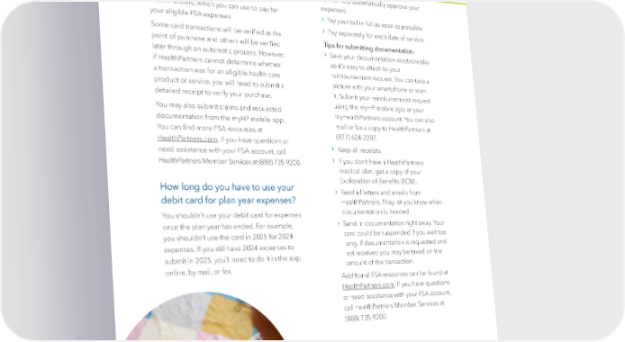Flexible Spending Accounts (FSA), continued Your FSA Debit Card FSA TIPS & RESOURCES When you enroll in the health care or limited Tips to help automatically approve your use FSA, you will receive a debit card from expenses: HealthPartners, which you can use to pay for › your eligible FSA expenses. P ay your bill in full as soon as possible. › Some card transactions will be veri昀椀ed at the P ay separately for each date of service. point of purchase and others will be veri昀椀ed Tips for submitting documentation: › later through an automatic process. However, Save your documenta tion electronically if HealthPartners cannot determine whether so it’s easy to attach to your a transaction was for an eligible health care reimbursement request. You can take a product or service, you will need to submit a picture with your smartphone or scan detailed receipt to verify your purchase. it. Submit your reimbursement request You may also submit claims and requested using the myHP mobile app or your documentation from the myHP mobile app. myHealthPartners account. You can also You can 昀椀nd more FSA resources at mail or fax a copy to HealthPartners at HealthPartners.com. If you have questions or (877) 624-2287. › need assistance with your FSA account, call K eep all receipts. › HealthPartners Member Services at (888) 735-9200. If you don’t have a HealthPartners medical plan, get a copy of your How long do you have to use your Explanation of Bene昀椀ts (EOB). › R ead all letters and emails from debit card for plan year expenses? HealthPartners. They let you know when You shouldn’t use your debit card for expenses documentation is needed. › once the plan year has ended. For example, Send in documenta tion right away. Your you shouldn’t use the card in 2025 for 2024 card could be suspended if you wait too expenses. If you still have 2024 expenses to long. If documentation is requested and submit in 2025, you’ll need to do it in the app, not received you may be taxed on the online, by mail, or fax. amount of the transaction. Additional FSA resources can be found at HealthPartners.com. If you have questions or need assistance with your FSA account, call HealthPartners Member Services at (888) 735-9200. | 21 |