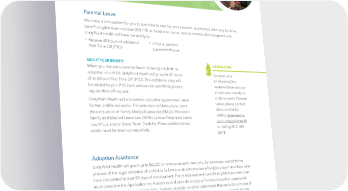 Parental Leave & Adoption Assistance Parental Leave We know it is important for you to take time to care for your newborn or adopted child. Any full-time bene昀椀t eligible team member (0.8 FTE or more) who has at least six months of employment with UnityPoint Health will have the ability to: › › R eceive 40 hours of additional Utilize a position- Paid Time Off (PTO) guaranteed leave ABOUT YOUR BENEFIT ABSENCEONE When you request a parental leave following the birth or adoption of a child, UnityPoint Health will provide 40 hours To speak with of additional Paid Time Off (PTO). The additional days will an AbsenceOne be added to your PTO bank and can be used through your representative who can regular time off request. answer your questions UnityPoint Health will also extend a position-guaranteed leave or to request a Parental for two additional weeks. This extension will take place upon Leave, please contact the exhaustion of Family Medical Leave Act (FMLA), Wisconsin AbsenceOne by Family and Medical Leave Law (WFMLL), Iowa Pregnancy Leave visiting absenceone. Law (IPLL), and/or Short- Term Disability. These additional two com/unitypointhealth weeks must be taken consecutively. or calling (877) 467- 2671. Adoption Assistance UnityPoint Health will grant up to $6,000 in reimbursement, per child, for expenses related to the process of the legal adoption of a child to full-time and part-time bene昀椀t eligible team members who have completed at least 90 days of employment. For reimbursement, bene昀椀t eligible team members must complete the Application for Assistance and provide a copy of 昀椀nalized adoption paperwork along with copies of appropriate bills, invoices, receipts, or other statements that verify the amount of adoption assistance being requested. This is done by submitting a case in Lawson to AskHR. If both parents work for UnityPoint Health, the total amount of reimbursement per legal adoption of a child is up to $6,000 per child. | 37 |
