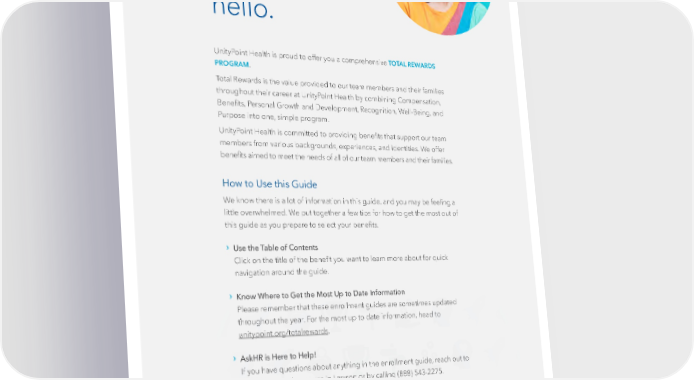 hello. UnityPoint Health is proud to offer you a comprehensive TOTAL REWARDS . PROGRAM Total Rewards is the value provided to our team members and their families throughout their career at UnityPoint Health by combining Compensation, Bene昀椀ts, Personal Growth and Development, Recognition, Well-Being, and Purpose into one, simple program. UnityPoint Health is committed to providing bene昀椀ts that support our team members from various backgrounds, experiences, and identities. We offer bene昀椀ts aimed to meet the needs of all of our team members and their families. How to Use this Guide We know there is a lot of information in this guide, and you may be feeling a little overwhelmed. We put together a few tips for how to get the most out of this guide as you prepare to select your bene昀椀ts. › Use the Table of Contents Click on the title of the bene昀椀t you want to learn more about for quick navigation around the guide. › Know Where to Get the Most Up to Date Information Please remember that these enrollment guides are sometimes updated throughout the year. For the most up to date information, head to unitypoint.org/totalrewards. › AskHR is Here to Help! If you have questions about anything in the enrollment guide, reach out to AskHR by creating a case in Lawson or by calling (888) 543-2275. | 1 |