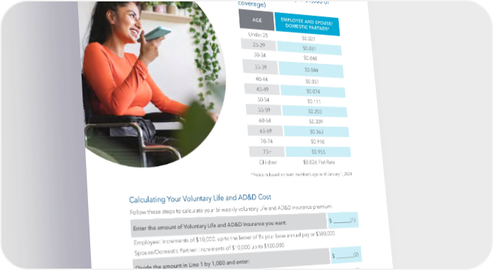 Life and Accidental Death & Dismemberment Insurance, continued Bi-Weekly Voluntary Life and AD&D Insurance Premiums (per $1,000 of coverage) AGE EMPLOYEE AND SPOUSE/ DOMESTIC PARTNER* Under 25 $0.027 25-29 $0.031 30-34 $0.040 35-39 $0.044 40-44 $0.051 45-49 $0.074 50-54 $0.111 55-59 $0.203 60-64 $0.309 65-69 $0.563 70-74 $0.910 75+ $0.955 Children $0.026 Flat Rate *Premium based on team member’s age as of January 1, 2024 Calculating Your Voluntary Life and AD&D Cost Follow these steps to calculate your bi-weekly voluntary Life and AD&D insurance premium: Enter the amount of Voluntary Life and AD&D Insurance you want: $ ________(1) Employee: Increments of $10,000, up to the lesser of 8x your base annual pay or $500,000 Spouse/Domestic Partner: Increments of $10,000 up to $100,000 Divide the amount in Line 1 by 1,000 and enter: $ ________(2) Use the chart above to 昀椀nd the bi-weekly cost for employee’s age and enter: $ ________(3) Multiply the amount in Line 2 by the amount in Line 3 and enter: This is your bi-weekly cost for Voluntary Life and AD&D Insurance $ ________(4) Note: Your cost can change if your coverage amount changes, your age changes, or if the insurance rates change. | 24 |
