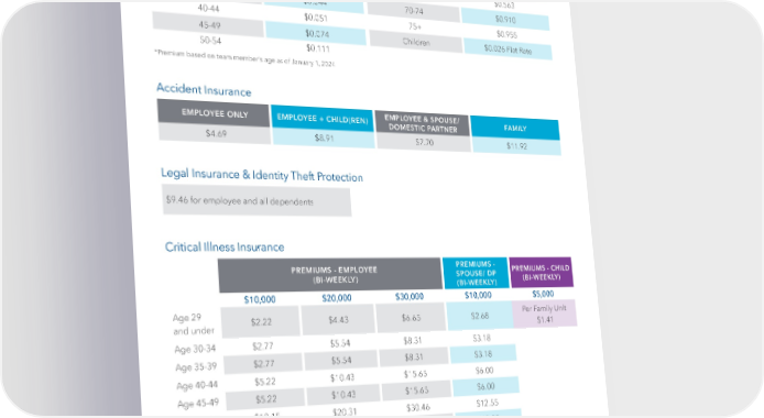 Voluntary Life and AD&D Insurance (Bi-Weekly Premiums, per $1,000 of coverage) AGE EMPLOYEE & SPOUSE/ AGE EMPLOYEE & SPOUSE/ DOMESTIC PARTNER* DOMESTIC PARTNER* Under 25 $0.027 55-59 $0.203 25-29 $0.031 60-64 $0.309 30-34 $0.040 65-69 $0.563 35-39 $0.044 70-74 $0.910 40-44 $0.051 75+ $0.955 45-49 $0.074 Children $0.026 Flat Rate 50-54 $0.111 *Premium based on team member’s age as of January 1, 2024 Accident Insurance EMPLOYEE ONLY EMPLOYEE + CHILD(REN) EMPLOYEE & SPOUSE/ FAMILY DOMESTIC PARTNER $4.69 $8.91 $7.70 $11.92 Legal Insurance & Identity Theft Protection $9.46 for employee and all dependents Critical Illness Insurance PREMIUMS - EMPLOYEE PREMIUMS - PREMIUMS - CHILD (BI-WEEKLY) SPOUSE/ DP (BI-WEEKLY) (BI-WEEKLY) $10,000 $20,000 $30,000 $10,000 $5,000 Age 29 $2.22 $4.43 $6.65 $2.68 Per Family Unit and under $1.41 Age 30-34 $2.77 $5.54 $8.31 $3.18 Age 35-39 $2.77 $5.54 $8.31 $3.18 Age 40-44 $5.22 $10.43 $15.65 $6.00 Age 45-49 $5.22 $10.43 $15.65 $6.00 Age 50-54 $10.15 $20.31 $30.46 $12.55 Age 55-59 $10.15 $20.31 $30.46 $12.55 Age 60-64 $14.68 $29.35 $44.03 $19.15 Age 65-70 $18.88 $37.75 $56.63 $21.92 Age 70+ $25.48 $50.95 $76.43 $33.05 | 43 |