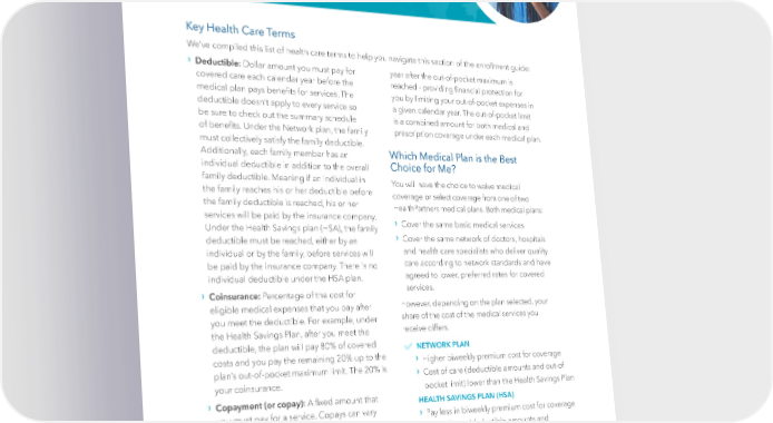 Health Insurance Key Health Care Terms We’ve compiled this list of health care terms to help you navigate this section of the enrollment guide: › Deductible: Dollar amount you must pay for year after the out-of-pocket maximum is covered care each calendar year before the reached - providing 昀椀nancial protection for medical plan pays bene昀椀ts for services. The you by limiting your out-of-pocket expenses in deductible doesn’t apply to every service so a given calendar year. The out-of-pocket limit be sure to check out the summary schedule is a combined amount for both medical and of bene昀椀ts. Under the Network plan, the family prescription coverage under each medical plan. must collectively satisfy the family deductible. Additionally, each family member has an Which Medical Plan is the Best individual deductible in addition to the overall Choice for Me? family deductible. Meaning if an individual in You will have the choice to waive medical the family reaches his or her deductible before coverage or select coverage from one of two the family deductible is reached, his or her HealthPartners medical plans. Both medical plans: services will be paid by the insurance company. › Under the Health Savings plan (HSA), the family Cover the same basic medical services › deductible must be reached, either by an C over the same network of doctors, hospitals individual or by the family, before services will and health care specialists who deliver quality be paid by the insurance company. There is no care according to network standards and have individual deductible under the HSA plan. agreed to lower, preferred rates for covered › services. Coinsurance: Percentage of the cost for eligible medical expenses that you pay after However, depending on the plan selected, your you meet the deductible. For example, under share of the cost of the medical services you the Health Savings Plan, after you meet the receive differs. deductible, the plan will pay 80% of covered NETWORK PLAN costs and you pay the remaining 20% up to the › Higher biweekly pr emium cost for coverage plan’s out-of-pocket maximum limit. The 20% is › C ost of care (deductible amounts and out-of your coinsurance. pocket limit) lower than the Health Savings Plan › Copayment (or copay): A 昀椀xed amount that HEALTH SAVINGS PLAN (HSA) you must pay for a service. Copays can vary › P ay less in biweekly premium cost for coverage depending on the service you receive. › C ost of care (deductible amounts and › Network Providers: Providers who have agreed out-of-pocket limit) will be higher than the to lower rates for services. The UnityPoint Health Network Plan medical plans provide bene昀椀ts for covered › UnityP oint Health contributes to your services provided by network providers. Health Savings Account to help offset out-of- › Out-of-Pocket Maximum (OOPM): Maximum pocket costs dollar amount that you pay for eligible expenses in a calendar year. The plan pays 100% of eligible expenses for the rest of the calendar | 5 |