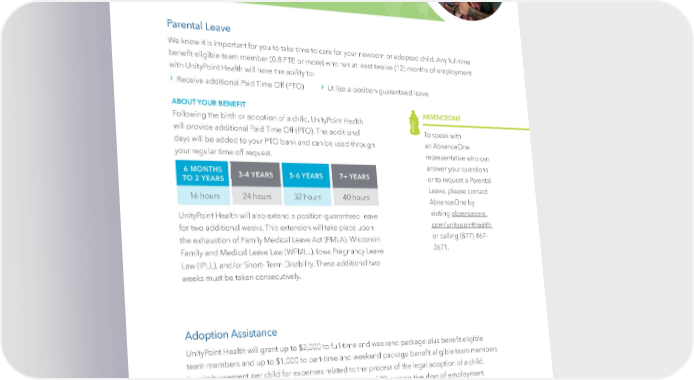 Parental Leave & Adoption Assistance Parental Leave We know it is important for you to take time to care for your newborn or adopted child. Any full-time bene昀椀t eligible team member (0.8 FTE or more) who has at least twelve (12) months of employment with UnityPoint Health will have the ability to: › › R eceive additional Paid Time Off (PTO) Utilize a position-guar anteed leave ABOUT YOUR BENEFIT ABSENCEONE Following the birth or adoption of a child, UnityPoint Health will provide additional Paid Time Off (PTO). The additional To speak with days will be added to your PTO bank and can be used through an AbsenceOne your regular time off request. representative who can 6 MONTHS answer your questions TO 2 YEARS 3-4 YEARS 5-6 YEARS 7+ YEARS or to request a Parental Leave, please contact 16 hours 24 hours 32 hours 40 hours AbsenceOne by UnityPoint Health will also extend a position-guaranteed leave visiting absenceone. for two additional weeks. This extension will take place upon com/unitypointhealth the exhaustion of Family Medical Leave Act (FMLA), Wisconsin or calling (877) 467- Family and Medical Leave Law (WFMLL), Iowa Pregnancy Leave 2671. Law (IPLL), and/or Short- Term Disability. These additional two weeks must be taken consecutively. Adoption Assistance UnityPoint Health will grant up to $2,000 to full-time and weekend package plus bene昀椀t eligible team members and up to $1,000 to part-time and weekend package bene昀椀t eligible team members in reimbursement per child for expenses related to the process of the legal adoption of a child. Team members are eligible after successful completion of 90 consecutive days of employment. For reimbursement, proof of qualifying expenses must be provided within 60 calendar days of the 昀椀nalization of adoption. If spouses both work for UnityPoint Health, the reimbursement will be paid to the team member eligible for the higher amount. If both team members are eligible for the same bene昀椀t amount, the reimbursement will be split equally between the team members. | 34 |