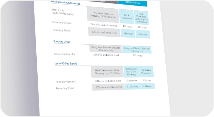 Health Insurance, continued Compare Health Insurance Plans, continued HEALTH SAVINGS PLAN NETWORK PLAN (HSA) Prescription Drug Coverage Tier 2 Retail Clinic Any Retail Pharmacy Tier 1 Pharmacies (Up to 30-day supply) (excluding CVS pharmacies) Pharmacies (excluding CVS pharmacies) Formulary Generic 20% after deductible is met $10 copay $20 copay Formulary Brand 20% after deductible is met $40 copay $50 copay Specialty Drugs Designated Network Specialty Designated Network Specialty Pharmacy only Pharmacy only Formulary Specialty 20% after deductible is met $60 copay Up to 90-Day Supply HealthPartners Mail Order HealthPartners UPH Af昀椀liate Pharmacy and UPH Af昀椀liate Mail Order Pharmacies Pharmacy Formulary Generic 20% after deductible is met $30 copay $25 copay Formulary Brand 20% after deductible is met $120 copay $100 copay | 10 |