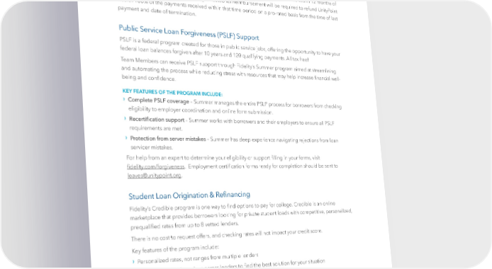 Education Assistance, continued Work Commitment A Team Member who voluntarily terminates employment or is terminated for cause within 12 months of receiving education assistance through Traditional Reimbursement will be required to refund UnityPoint Health 100% of the payments received within that time period on a pro-rated basis from the time of last payment and date of termination. Public Service Loan Forgiveness (PSLF) Support PSLF is a federal program created for those in public service jobs, offering the opportunity to have your federal loan balances forgiven after 10 years and 120 qualifying payments. All tax free! Team Members can receive PSLF support through Fidelity’s Summer program aimed at streamlining and automating the process while reducing stress with resources that may help increase 昀椀nancial well- being and con昀椀dence. KEY FEATURES OF THE PROGRAM INCLUDE: › Complete PSLF coverage – Summer manages the entire PSLF process for borrowers from checking eligibility to employer coordination and online form submission. › Recerti昀椀cation support – Summer works with borrowers and their employers to ensure all PSLF requirements are met. › Protection from server mistakes – Summer has deep experience navigating rejections from loan servicer mistakes. For help from an expert to determine your eligibility or support 昀椀lling in your forms, visit 昀椀delity.com/forgiveness. Employment certi昀椀cation forms ready for completion should be sent to [email protected]. Student Loan Origination & Re昀椀nancing Fidelity’s Credible program is one way to 昀椀nd options to pay for college. Credible is an online marketplace that provides borrowers looking for private student loads with competitive, personalized, prequali昀椀ed rates from up to 8 vetted lenders. There is no cost to request offers, and checking rates will not impact your credit score. Key features of the program include: › Personalized rates, not ranges from multiple lenders › Ability to comparison shop across lenders to 昀椀nd the best solution for your situation › No hidden fees, original fees, or prepayment penalties › Simple online process that keeps your data con昀椀dential. To access Credible log into the Fidelity portal at netbene昀椀ts.com. | 42 |