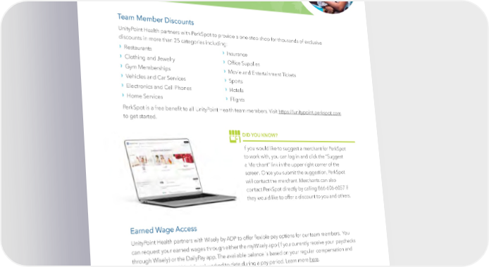 Team Member Discounts Team Member Discounts UnityPoint Health partners with PerkSpot to provide a one-stop shop for thousands of exclusive discounts in more than 25 categories including: › › Restaurants Insurance › › Clothing and Jewelry Of昀椀ce Supplies › › Gym Memberships Movie and Enter tainment Tickets › › V ehicles and Car Services Sports › › Electr onics and Cell Phones Hotels › › Home Services Flights PerkSpot is a free bene昀椀t to all UnityPoint Health team members. Visit https://unitypoint.perkspot.com to get started. DID YOU KNOW? If you would like to suggest a merchant for PerkSpot to work with, you can log in and click the “Suggest a Merchant” link in the upper right corner of the screen. Once you submit the suggestion, PerkSpot will contact the merchant. Merchants can also contact PerkSpot directly by calling 866-606-6057 if they would like to offer a discount to you and others. Earned Wage Access UnityPoint Health partners with Wisely by ADP to offer 昀氀exible pay options for our team members. You can request your earned wages through either the myWisely app (if you currently receive your paychecks through Wisely) or the DailyPay app. The available balance is based on your regular compensation and hours (minus any withholdings) worked to date during a pay period. Learn more here. | 38 |