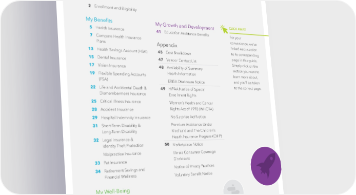 Table of Contents 1 Hello 2 Enrollment and Eligibility My Bene昀椀ts My Growth and Development CLICK AWAY 5 Health Insurance 41 Education Assistance Bene昀椀ts For your 7 Compare Health Insurance convenience, we’ve Plans Appendix linked each section 13 Health Savings Account (HSA) 45 Cost Breakdown to its corresponding 47 Vendor Contact List page in this guide. 15 Dental Insurance Simply click on the 17 Vision Insurance 48 Availability of Summary section you want to 19 Flexible Spending Accounts Health Information learn more about, (FSA) ERISA Disclosure Notice and you’ll be taken 22 Life and Accidental Death & 49 HIPAA Notice of Special to the correct page. Dismemberment Insurance Enrollment Rights 25 Critical Illness Insurance Women’s Health and Cancer 28 Accident Insurance Rights Act of 1998 (WHCRA) 29 Hospital Indemnity Insurance No Surprise Act Notice 31 Short-Term Disability & Premium Assistance Under Long-Term Disability Medicaid and The Children’s 32 Legal Insurance & Health Insurance Program (CHIP) Identity Theft Protection 50 Marketplace Notice Malpractice Insurance Illinois Consumer Coverage 33 Pet Insurance Disclosure 34 Retirement Savings and Notice of Privacy Practices Financial Wellness Voluntary Bene昀椀t Notice My Well-Being 36 Vacation Time 37 Parental Leave & Adoption Assistance 38 Team Member Discounts and Earned Wage Access 39 OnPoint for Health
