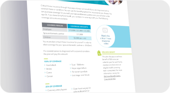Critical Illness Insurance Critical Illness Insurance through Voya pays a lump sum bene昀椀t if you are diagnosed with a covered illness or condition. You can use the bene昀椀t payment for any purpose you choose. You can purchase coverage for yourself, your spouse/domestic partner, and your children under age 26. If you leave UnityPoint Health, you can take this coverage with you. The following coverage amounts are available: COVERED PERSON COVERAGE AMOUNTS Employee $10,000 | $20,000 | $30,000 Spouse/domestic partner $10,000 Watch the Children $5,000 per child critical illness insurance You must elect critical illness insurance for yourself in order to video elect coverage for your spouse/domestic partner or child(ren). If a covered person is diagnosed with a covered condition, WELLNESS BENEFIT the plan will pay this amount: The plan also pays a wellness 100% OF COVERAGE bene昀椀t of $50 once per › › calendar year for each family Heart attack Type 1 Diabetes member enrolled when an › › Stroke Major organ failure eligible health screening › › test is completed. For more Coma Permanent paralysis › › information, review the Cancer End stage renal failure Wellness Bene昀椀t Claims Checklist & FAQ. 25% OF COVERAGE › › Coronary artery bypass Open heart surgery for › valve replacement or Carcinoma in situ repair 10% OF COVERAGE › › Skin cancer Transcatheter heart valve replacement or repair | 25 |