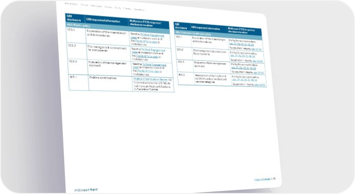 GRI disclosure GRI requested information McKesson FY21 response/ disclosure location 415: Public policy 103-1 Explanation of the material topic and its boundaries See the Political Engagement page at mckesson.com and the Public Affairs page at mckesson.eu 103-2 The management approach and its components See the Political Engagement page at mckesson.com and the Public Affairs page at mckesson.eu. 103-3 Evaluation of the management approach See the Political Engagement page at mckesson.com and the Public Affairs page at mckesson.eu. 415-1 Political contributions Political Contributions Report . All information is for the U.S. We do not make political contributions in Canada or Europe. GRI disclosure GRI requested information McKesson FY21 response/ disclosure location 416: Customer health and safety 103-1 Explanation of the material topic and its boundaries Caring for our communities, pgs. 24-26 , 30-31 , 48-50 Supply chain integrity, pgs. 62-65 103-2 The management approach and its components Caring for our communities, pgs. 24-26 , 30-31 , 48-50 Supply chain integrity, pgs. 62-65 103-3 Evaluation of the management approach Caring for our communities, pgs. 24-26 , 30-31 , 48-50 Supply chain integrity, pgs. 62-65 416-1 Assessment of the health and safety impacts of product and service categories Caring for our communities, pgs. 24-26 , 30-31 , 48-50 Supply chain integrity, pgs. 62-65 Introduction Stories Employees Access Equity Climate Operations >Table of Contents | 76 FY21 Impact Report
